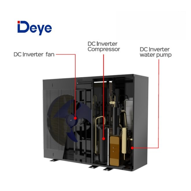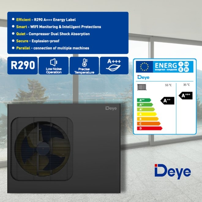 Pompa de căldură Deye oferă control WiFi, monitorizare inteligentă și protecții multiple integrate, asigurând o funcționare sigură și fiabilă pe termen lung. Este compatibilă cu sisteme de încălzire prin pardoseală, radiatoare sau ventiloconvectoare și poate produce atât agent termic pentru încălzire, cât și apă caldă menajeră.