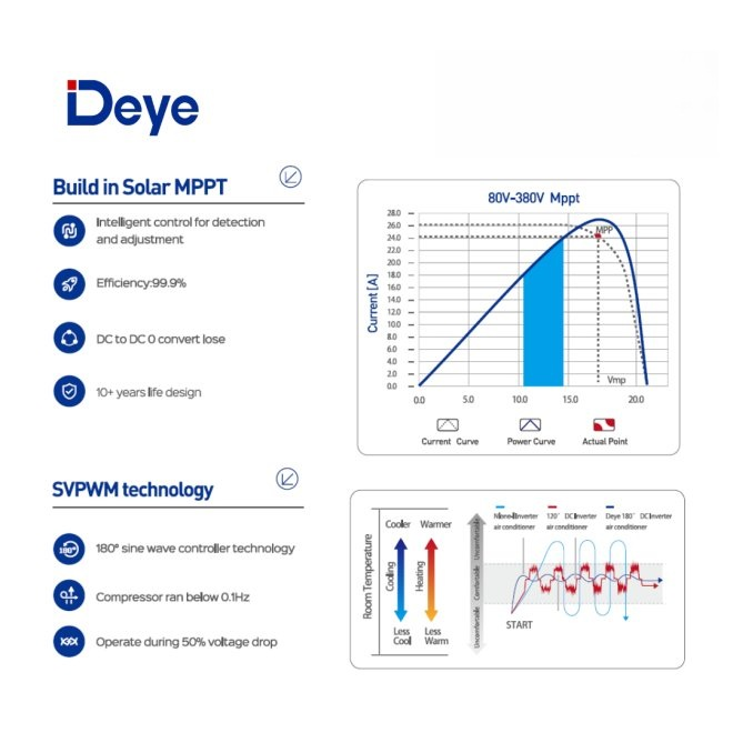 Pompa de căldură Deye Solar Heat Pump 12 kW este o soluție modernă de încălzire și răcire aer-apă, proiectată pentru integrare directă cu sisteme fotovoltaice. Echipamentul utilizează tehnologie hibridă solară, cu MPPT integrat, permițând alimentarea directă din panouri fotovoltaice, fără invertor suplimentar.